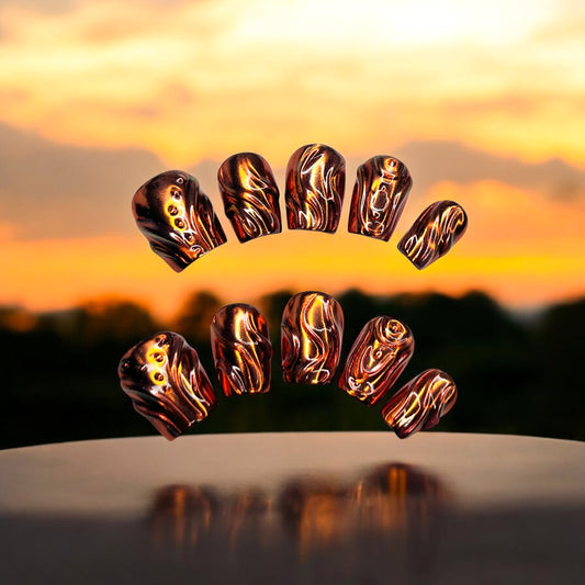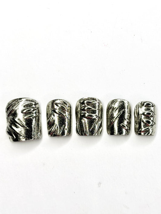 Sleek. Shiny. Unapologetic. Heavy Metal Bloom is a chrome-drenched collection where soft meets savage. Featuring high-shine finishes, molten metallics, and unexpected color pairings like moss green, silver, and crimson. From futuristic minimalism to creature-inspired glam, each set is a statement forged in gloss and grit.