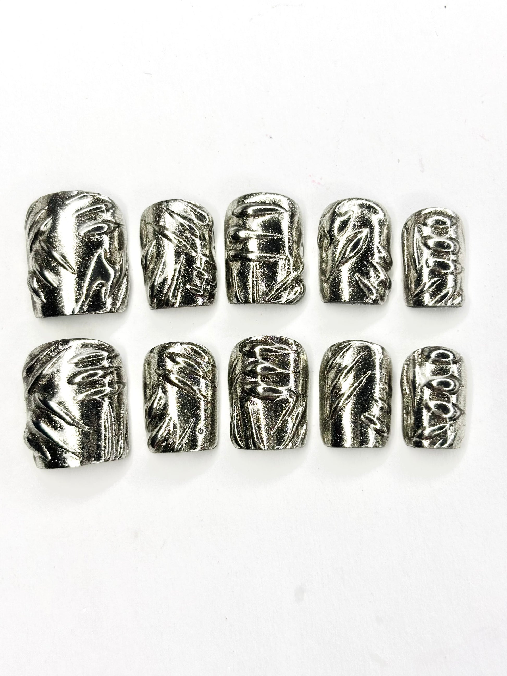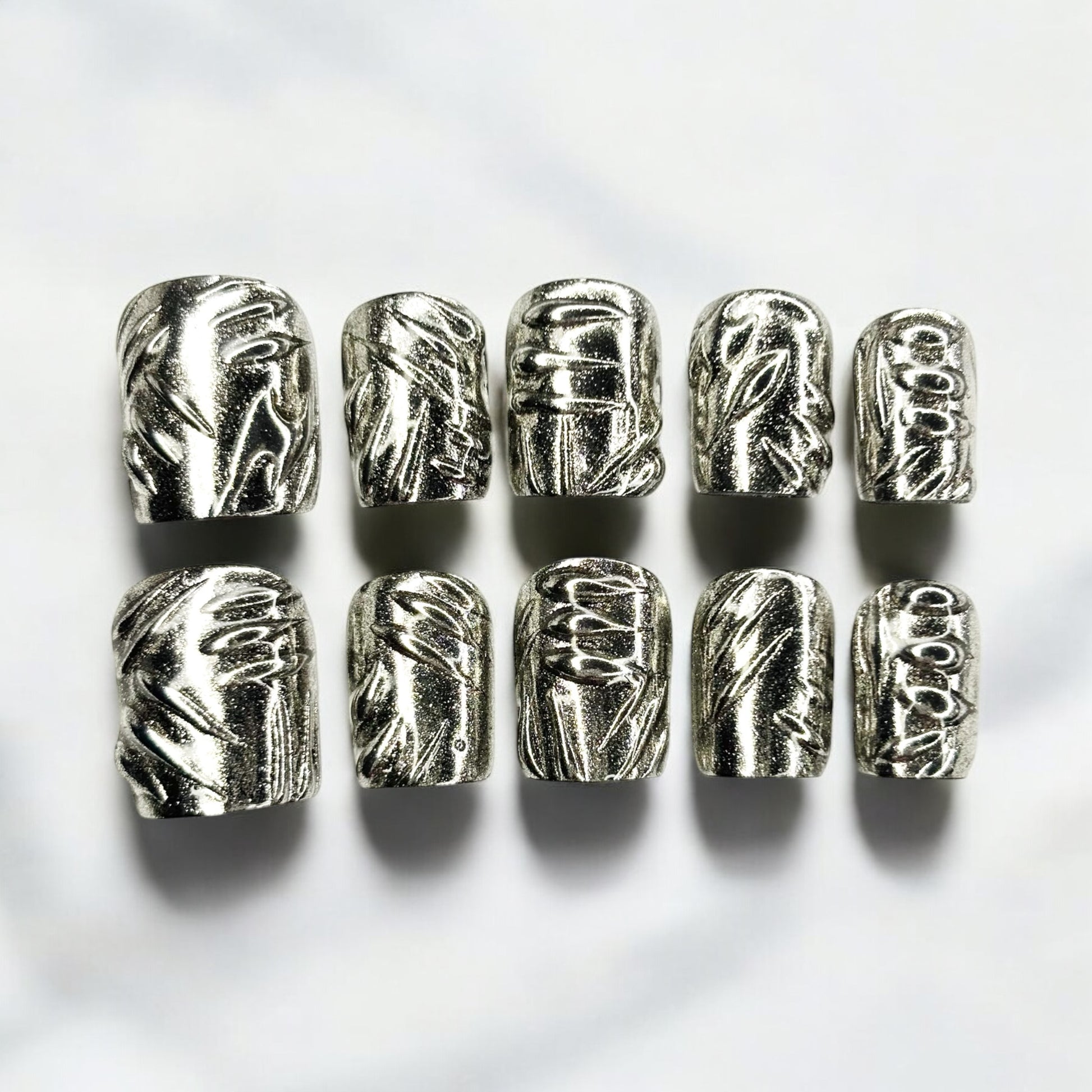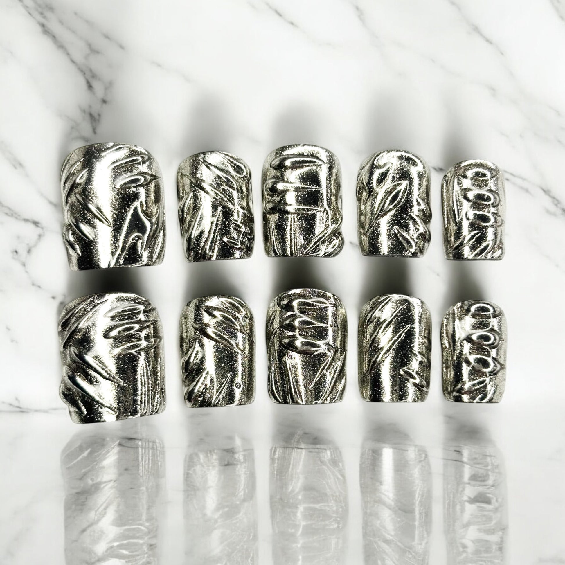 Clean, cool, and futuristic. Silver Circuit features a high-shine chrome base with raised 3D linework that adds just the right amount of edge. Short, sharp, and sculpted for everyday impact. This set is like wearable tech with a glam twist.