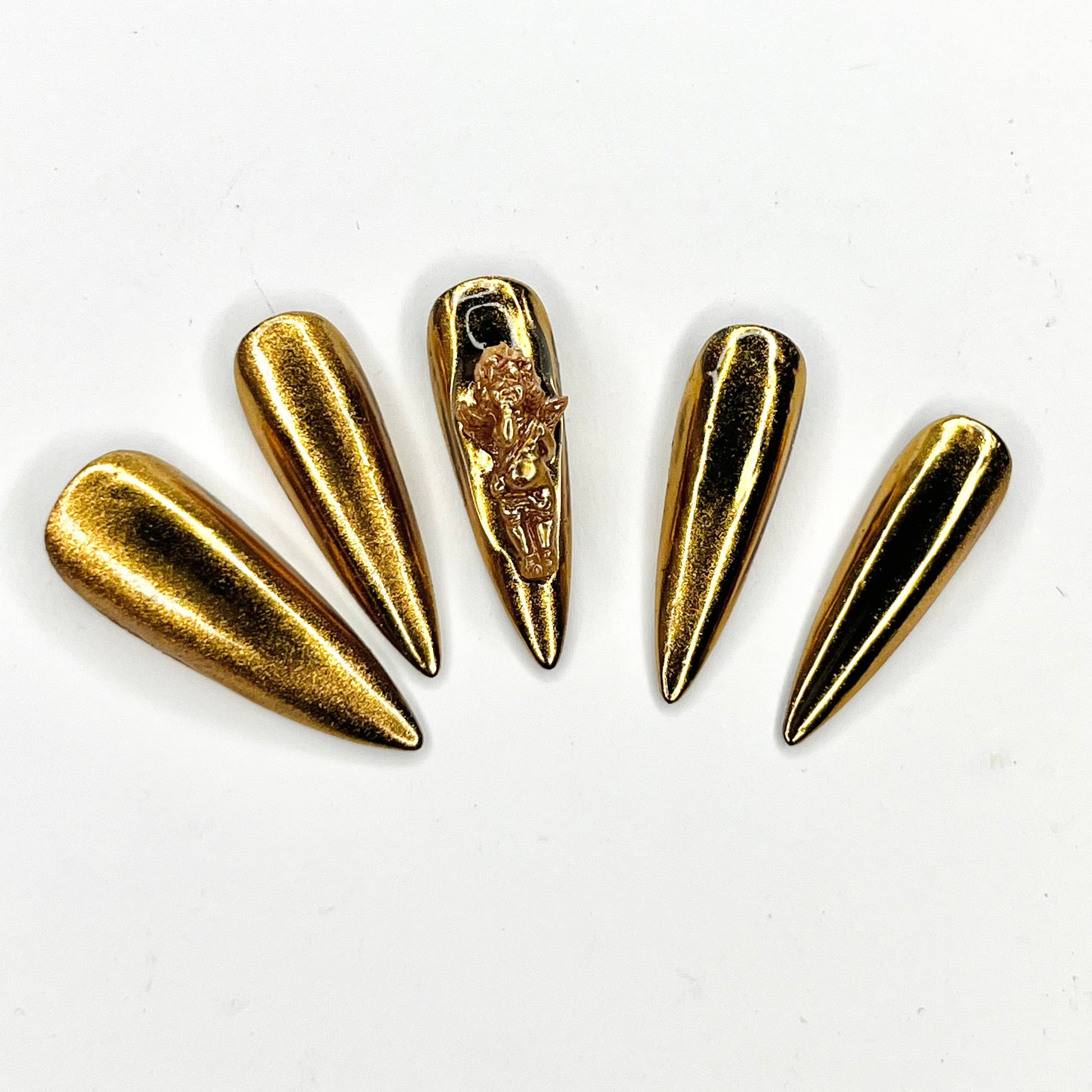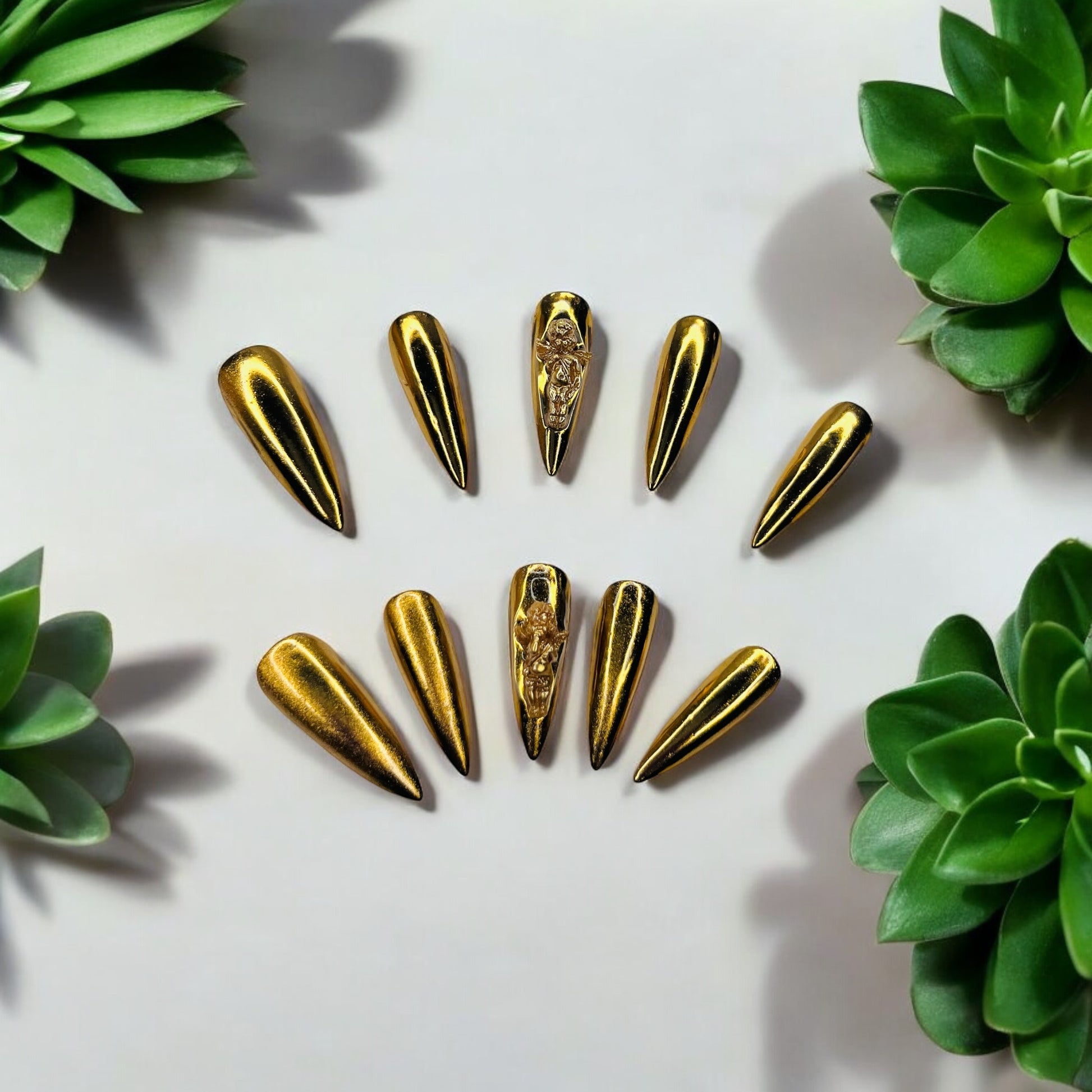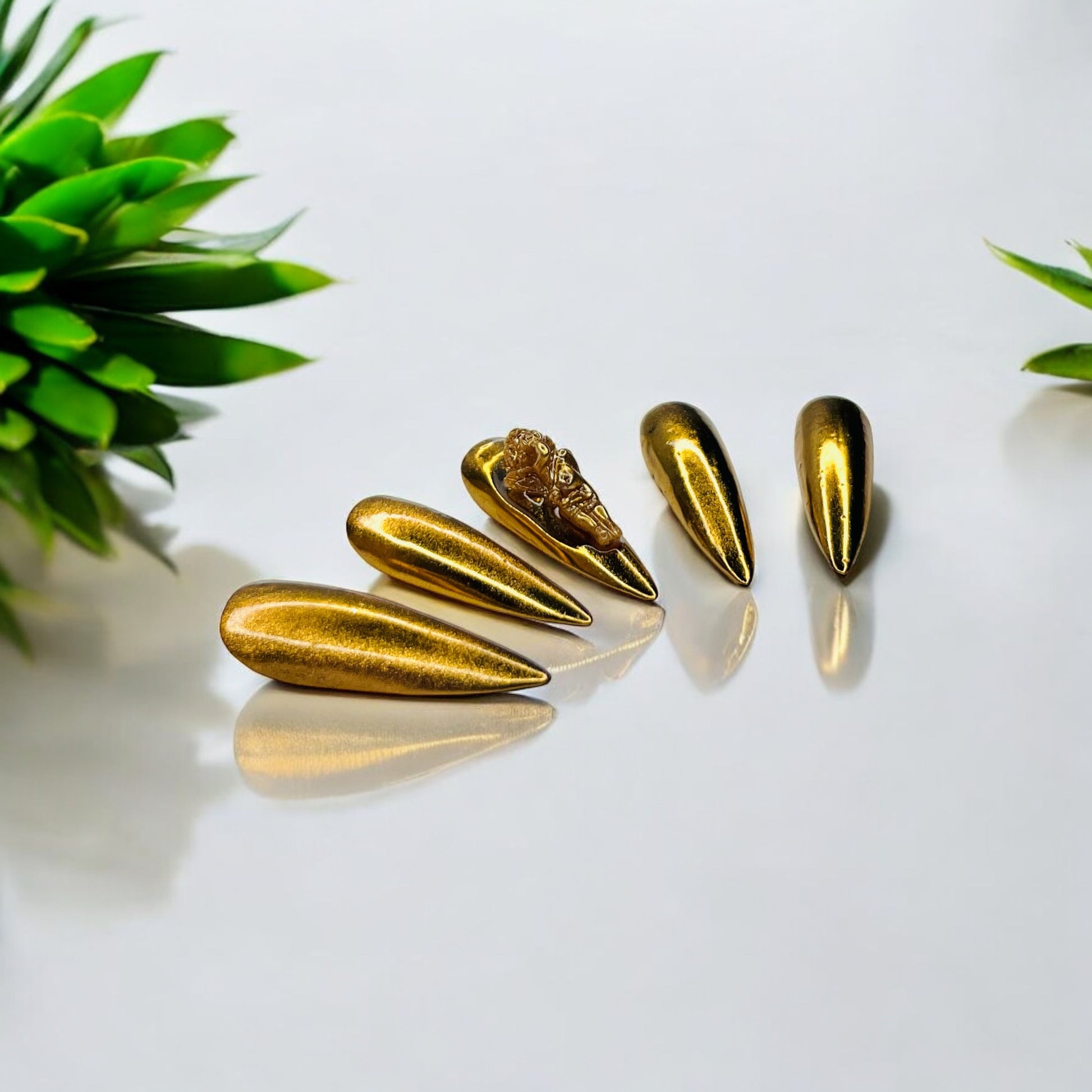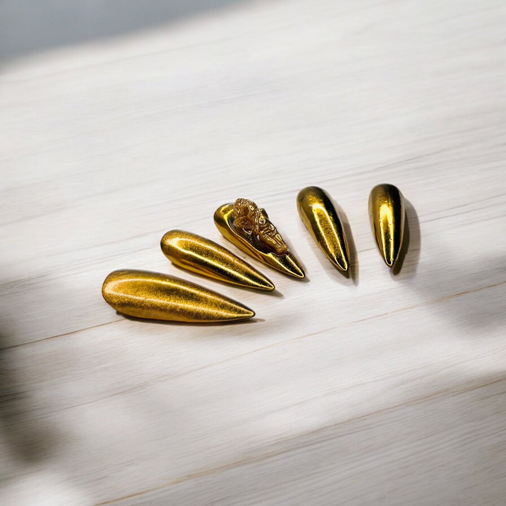 Sharp, sacred, and unforgettable. Golden Seraph features striking gold chrome stiletto nails crowned with a gold angel centerpiece on the middle finger. It's a fierce blend of divine beauty and bold energy. Made for the one who walks with grace and power.